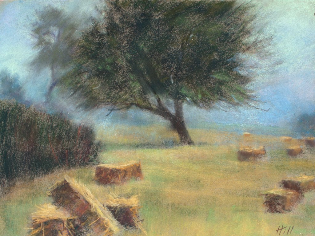 Beautiful ethereal light quality early on a summer day gives a harvested hay field (on the Davis Farm, Lopez Island) a mystery quality and awaits the blast of summer sun that is heating up the atmosphere.