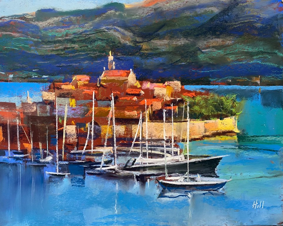 Painted en plein air overlooking old Korcula City on a beautiful October morning during my Croatia workshop last fall. I awoke to this warm light just peaking over the distant mountains of the Orebic Peninsula. It was as though someone had turned-on a kaleidoscopic flashlight pointed straight across the Adriatic Sea.