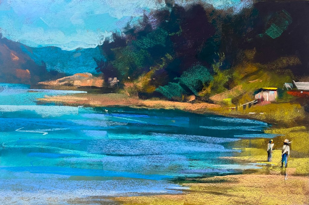 Painted en plein air July 2023 at Port Stanley in mid afternoon. Loved the 2 figures walking the edge of the tidal flats on a late afternoon in July against the strong deep color drop of the distant hillside and islands.